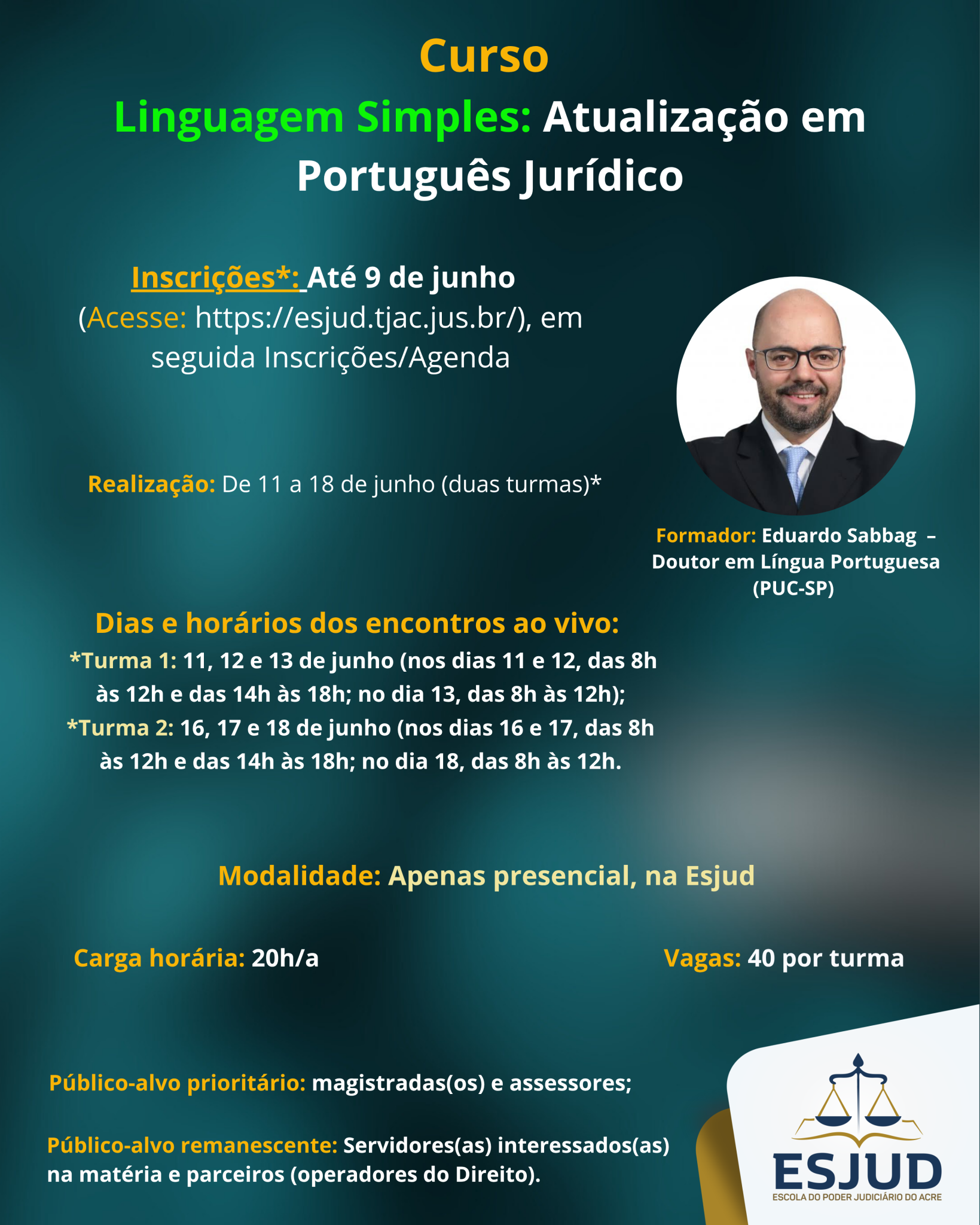 Capacitar profissionais da Justiça para aplicar os princípios da linguagem simples na produção de textos jurídicos, com domínio das normas gramaticais atualizadas, ortografia e acordo ortográfico vigente. Com esse objetivo, a Escola do Poder Judiciário do Acre (Esjud) realizará entre os dias 11 e 18 de junho o curso “Linguagem Simples: Atualização em Português Jurídico”, com o professor Eduardo Sabbag (veja currículo no final).