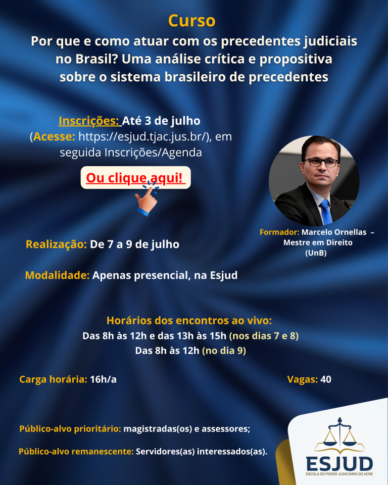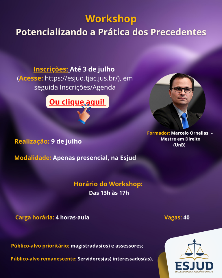 Na quarta-feira, 9 de julho, será realizado o Workshop “Potencializando a Prática dos Precedentes”, também com Marcelo Ornellas. Para participar do encontro é preciso se inscrever: (https://esjud.tjac.jus.br/ ), em seguida Inscrições/Agenda ou clicar diretamente no card abaixo.