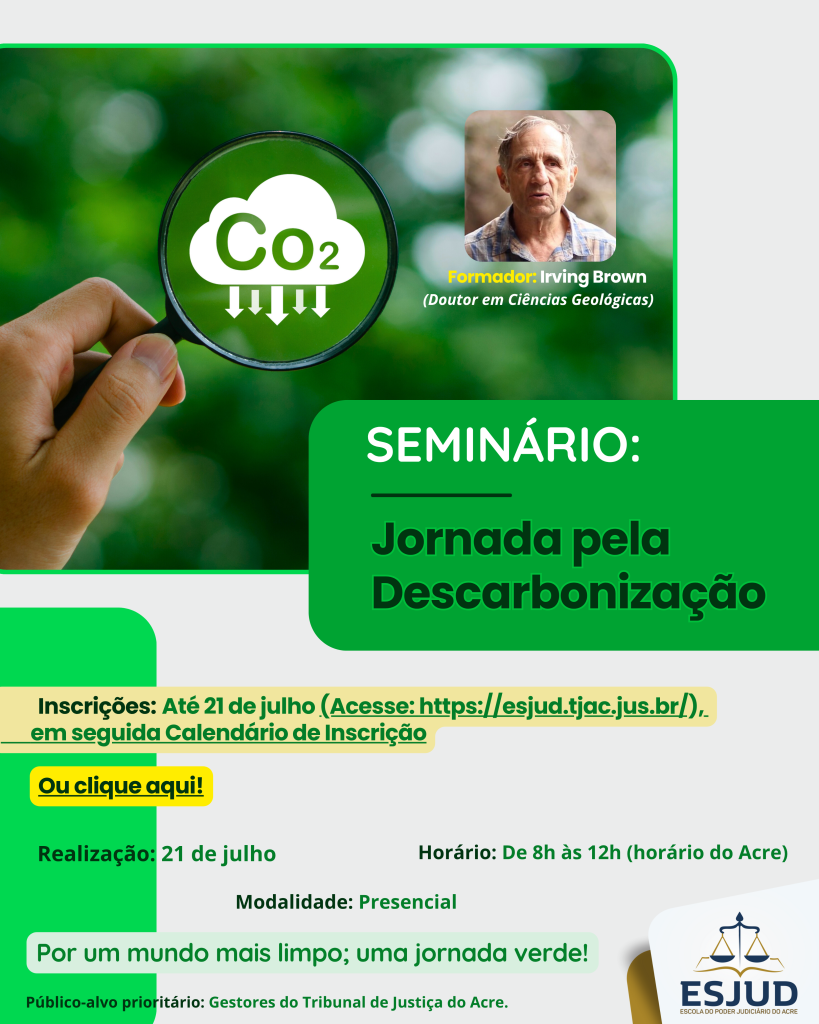 A Escola do Poder Judiciário do Acre (Esjud) abriu as inscrições para o Seminário: Jornada pela Descarbonização. O prazo segue até o dia 21 de julho, mesma data de realização da atividade.