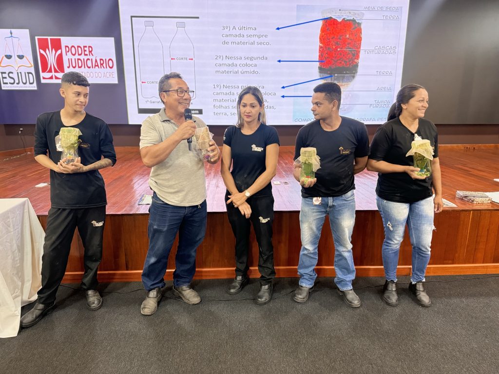 A agenda de conscientização e orientações, que reuniu profissionais prestadores de serviço à Justiça Estadual, também teve atividades práticas (veja abaixo). Havia mais de uma centena de pessoas (presencial e on-line pelo Meet) conectadas por um planeta mais sustentável.