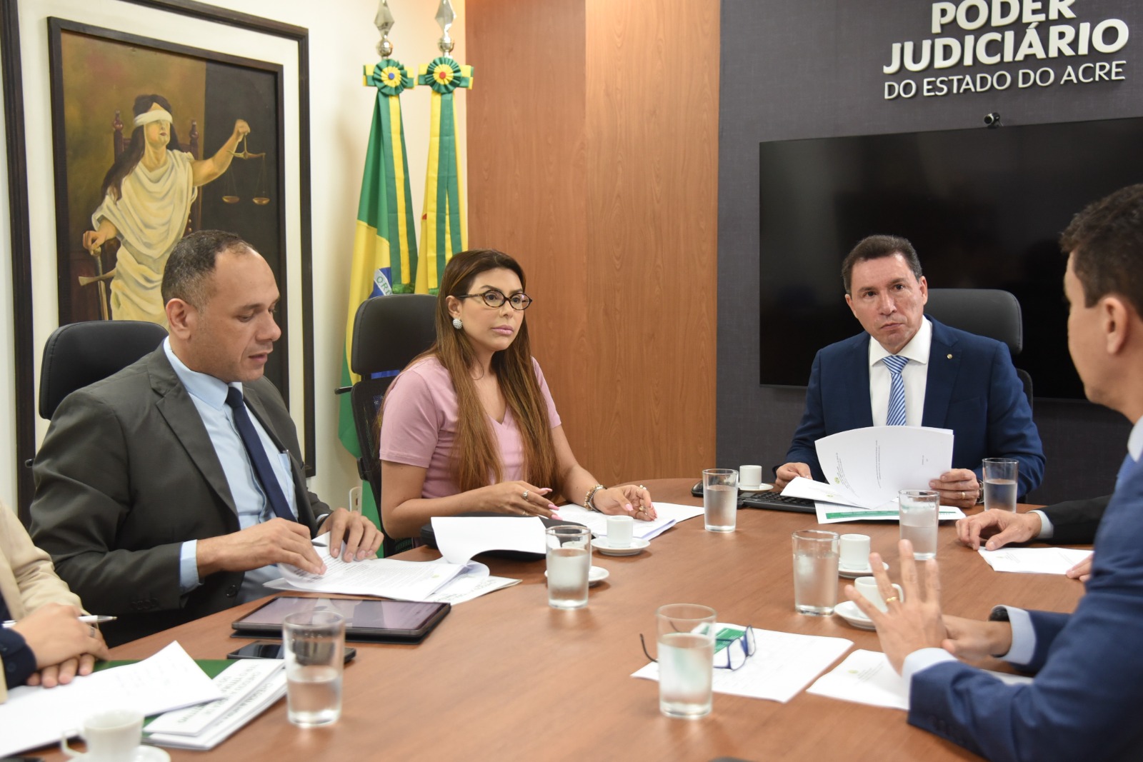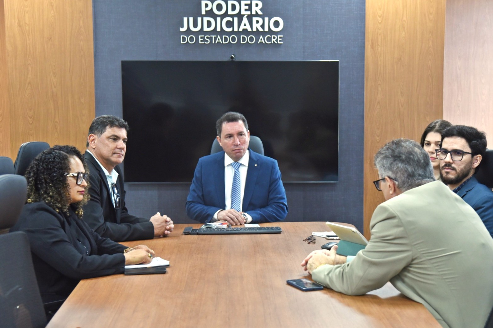 Em seguida, o desembargador-presidente recebeu o prefeito de Capixaba, Manoel Maia, acompanhado da equipe gestora do município, trataram de assuntos relacionados à gestão financeira e aos desafios orçamentários do município. A juíza auxiliar da presidência Louise Santana e o secretário da Coordenadoria de Gestão de Precatórios (COGEP) Mateus Wilian Lima de Queiroz acompanharam o diálogo.
