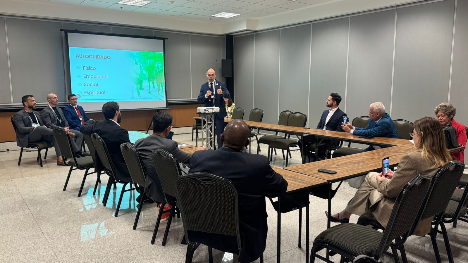 Após a apresentação na Arena de Palco, o juiz auxiliar da Presidência e o secretário-geral participaram de reunião com diretores-gerais de várias instituições. Na ocasião, os participantes trocaram informações sobre a situação de saúde de seus públicos internos, tiraram dúvidas e dividiram como procedem em cada situação. A médica endocrinologista Alliny Dourado, que atende no Centro Médico do TJAC, e é uma das colaboradoras do Programa de Assistência à Saúde Mental, também participou da atividade.