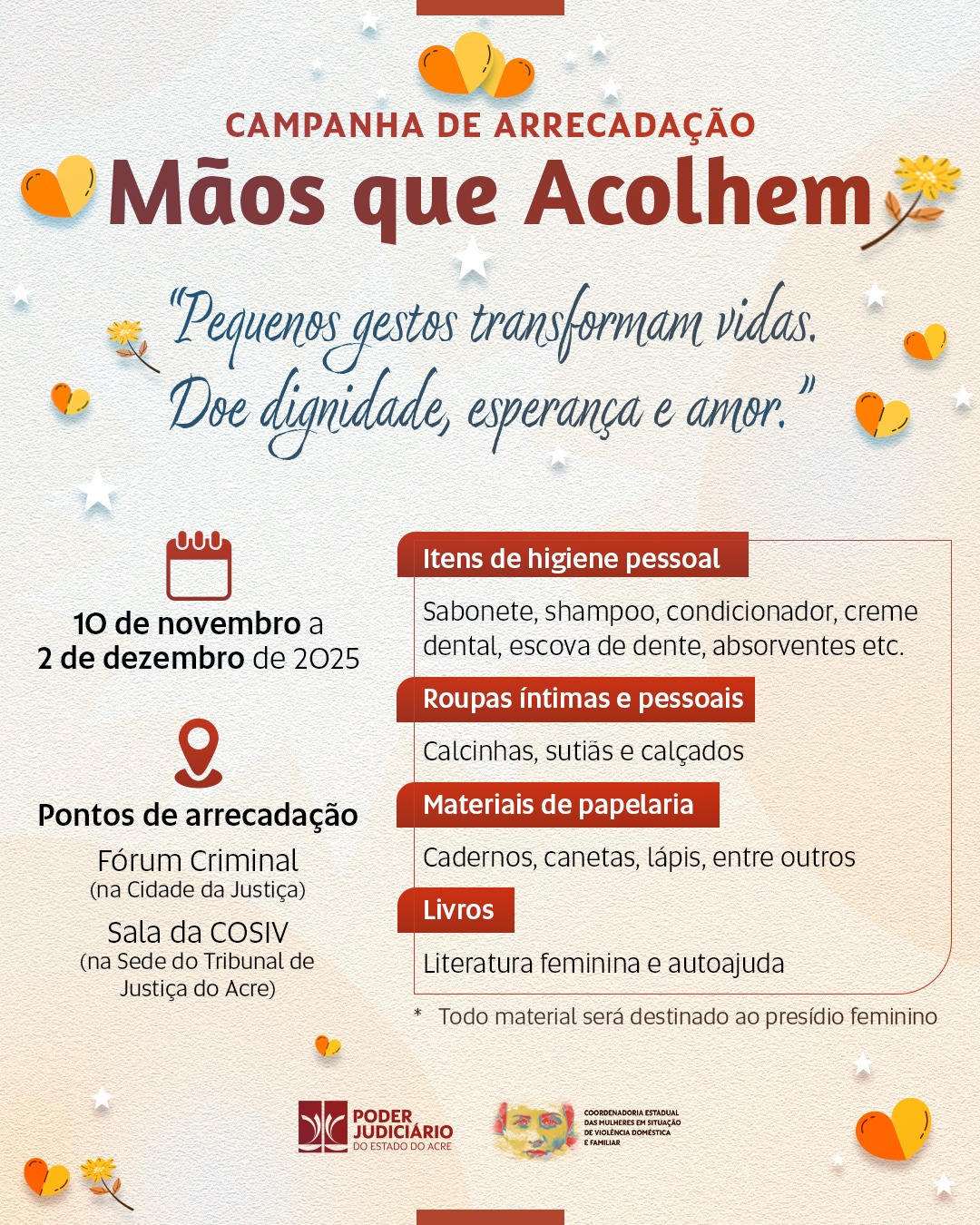 O Tribunal de Justiça do Acre (TJAC) está promovendo a campanha Mãos que Acolhem, iniciativa destinada à arrecadação de itens para mulheres em situação de privação de liberdade. Em Rio Branco, 172 reeducandas estão na unidade feminina do Complexo Penitenciário Francisco d’Oliveira Conde. No estado, esse número chega a aproximadamente 200 mulheres que poderão ser beneficiadas pela ação.