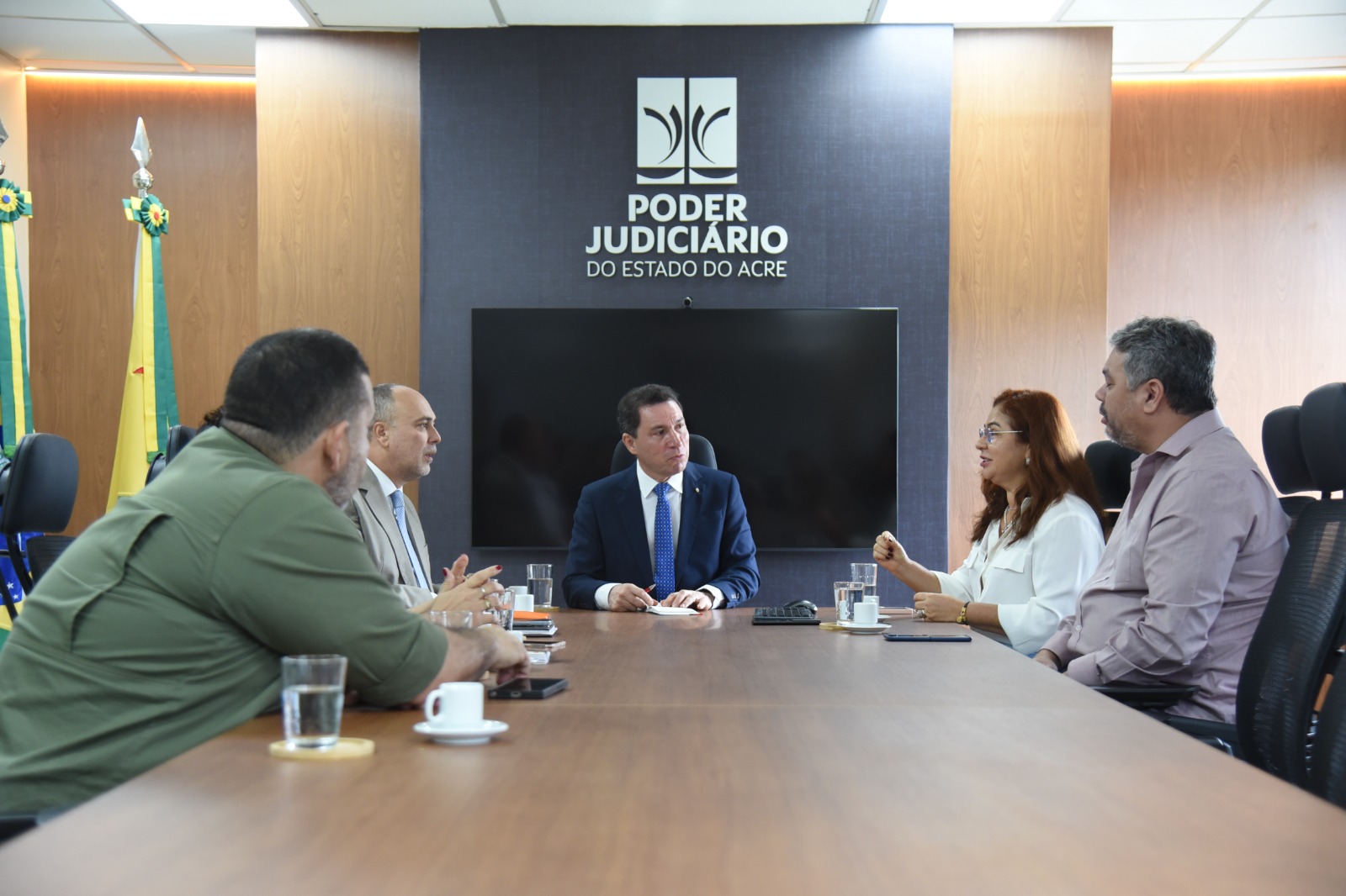 Nesta quinta-feira, 27, o presidente do Tribunal de Justiça do Acre (TJAC), desembargador Laudivon Nogueira, recebeu a presidente do Tribunal Regional Eleitoral do Acre (TRE-AC), desembargadora Waldirene Cordeiro, acompanhada do vice-presidente e corregedor da instituição eleitoral, desembargador Lois Arruda. A pauta da reunião são os últimos detalhes para eleição de Juíza e Juiz de Paz, que ocorrerá no domingo, 30.