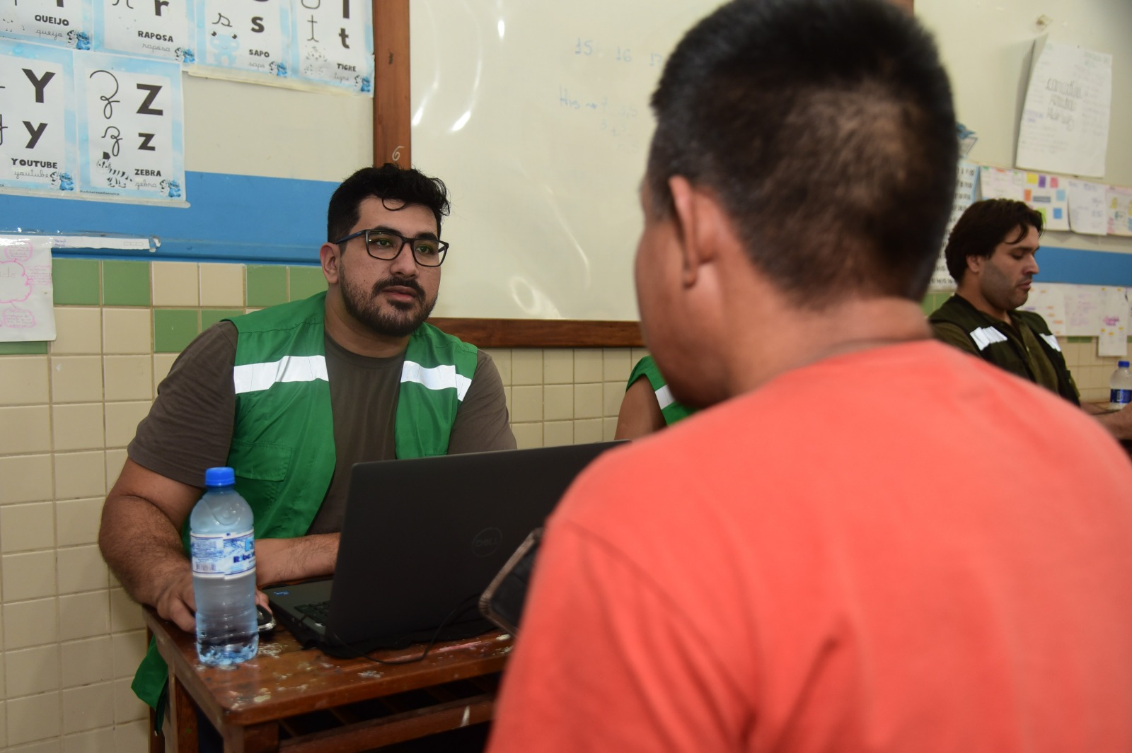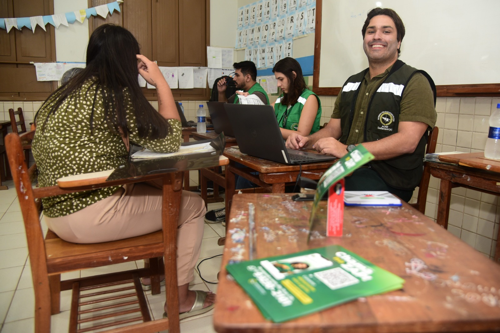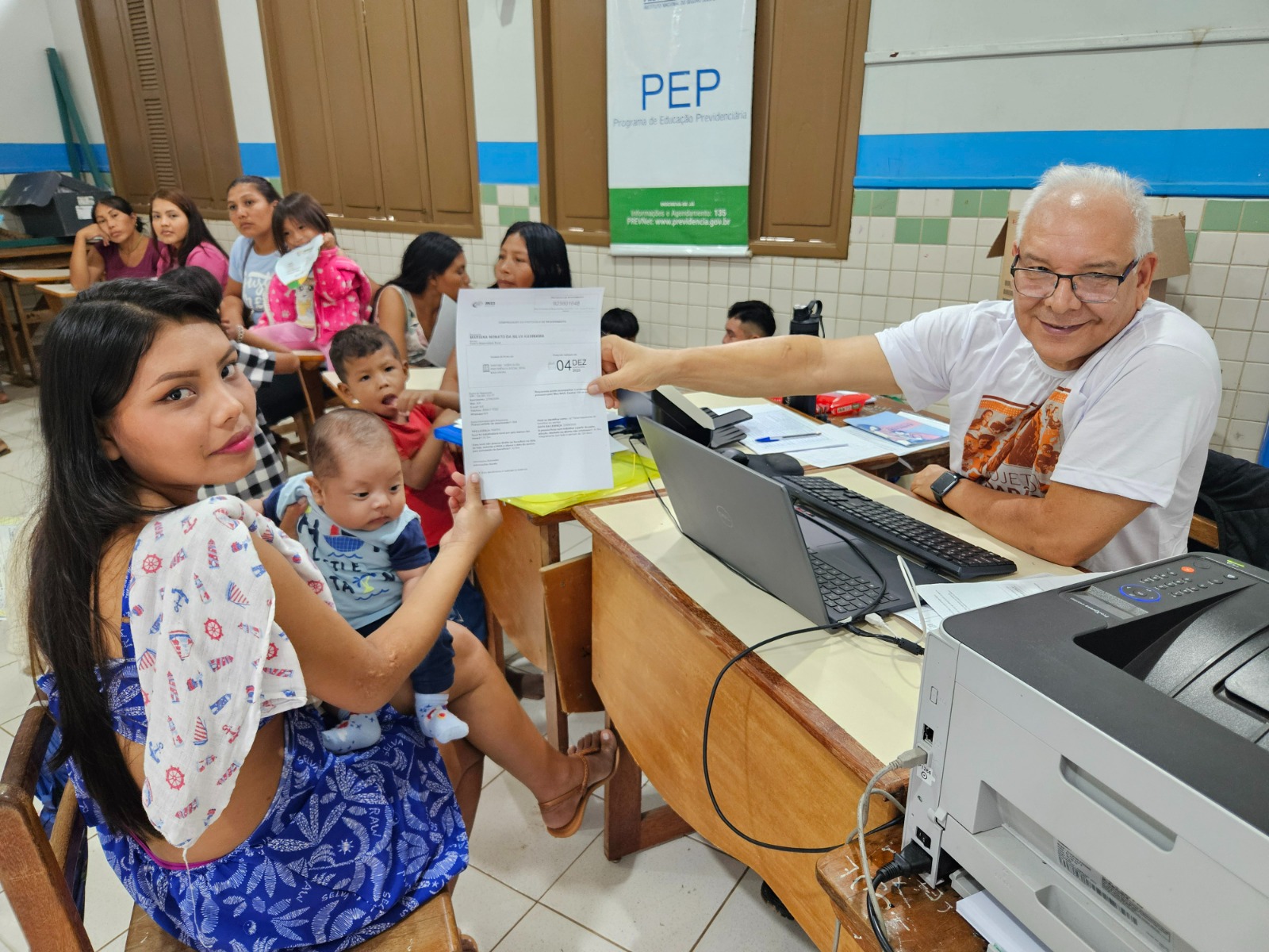 Logo cedo, no portão da escola, um senhor indígena chegou dizendo apenas: “Vim aqui, 64 anos”. Somente com a ajuda de outro indígena, que conversou com ele na língua materna e traduziu para as servidoras foi possível encaminhá-lo para verificar se tinha direito à aposentadoria. Quando não se fala em língua indígena, fala-se em espanhol — ou é necessário recorrer à linguagem simples, traduzindo termos e explicando cada atendimento.