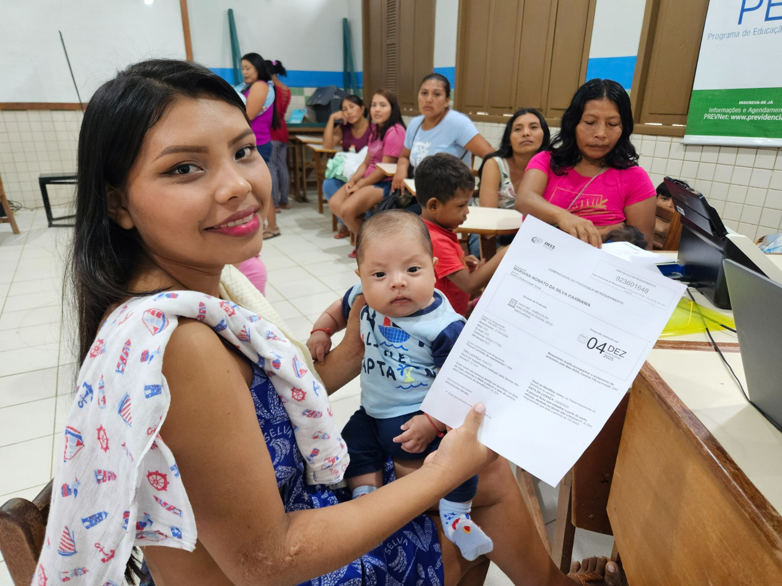 Já a adolescente Mariana Nonato da Silva Kaxinawá enfrentou cinco horas de canoa com o Wallace de dois meses de idade no colo, para conseguir o salário maternidade junto ao INSS. Mas, todo atendimento da jovem foi acompanhado pela tia Marilene Nonato Lopes Rodrigues Kaxinawá, que estava sendo voluntária no projeto, pois o atendente não falava o idioma indígena e a adolescente não entendia muito a língua portuguesa.