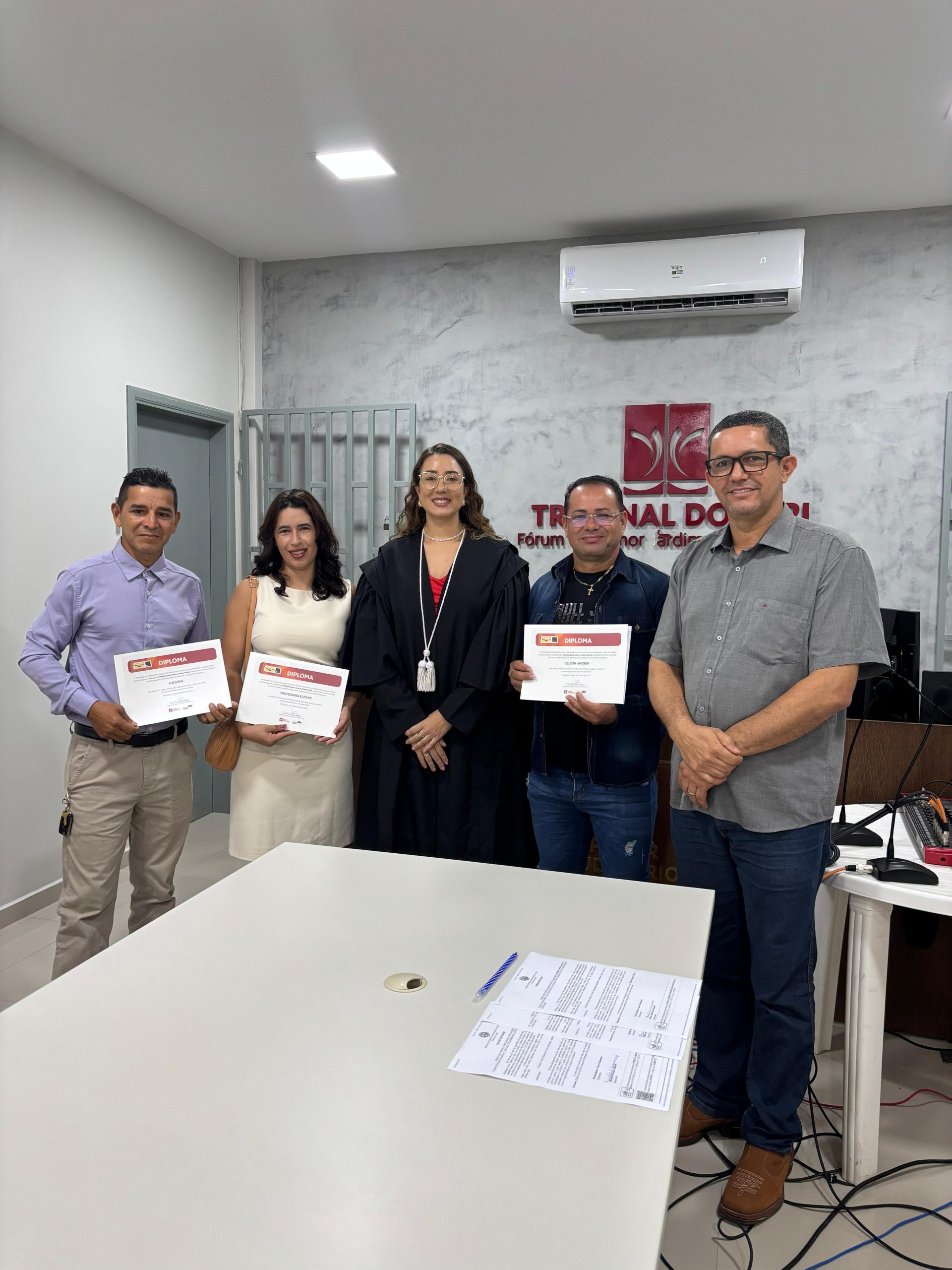 Após a diplomação, o rito de posse prosseguiu com a assinatura do Termo de Posse e a declaração de compromisso: “Prometo bem e fielmente cumprir a Constituição e as leis do Brasil. Exercer com ética, imparcialidade e dignidade o cargo de juiz de paz, para o qual fui eleita, visando sempre o bem da sociedade”