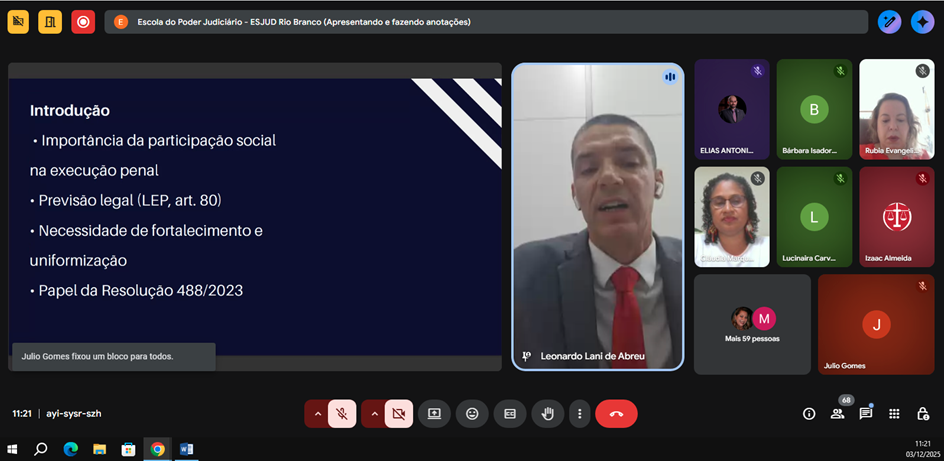 O Tribunal de Justiça do Acre (TJAC) e a Escola do Poder Judiciário do Acre (Esjud) promoveram nesta quarta-feira, 3, a formação “Conselhos da Comunidade e o Sistema de Justiça”.