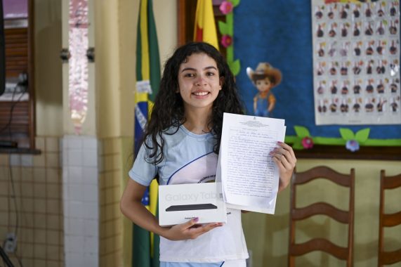 Emocionada, Júlia relatou sua dedicação para alcançar o primeiro lugar. Desde 2024, a aluna estuda e produz redações. “No ano passado, foi um desastre. Acabei não ganhando, mas neste a professora Mareide me ajudou bastante”, afirmou. Ela ainda contou como o prêmio irá auxiliá-la: “Nas matérias mais difíceis e também no lazer da minha irmã, que gosta muito de desenho”.