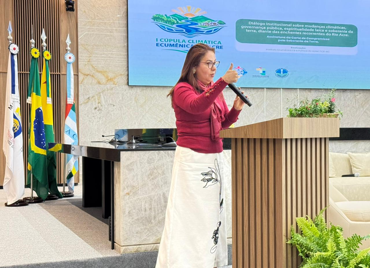 O Tribunal de Justiça do Acre (TJAC) marcou presença na I Cúpula Climática Ecumênica do Acre, realizada nesta sexta-feira, 30, no Plenário do Tribunal de Contas do Estado do Acre (TCE-AC). A instituição foi representada pela desembargadora Waldirene Cordeiro, presidente do Tribunal Regional Eleitoral do Acre (TRE-AC), que participou do encontro em nome do Judiciário acreano, reafirmando o compromisso do TJAC com o debate institucional sobre os impactos das mudanças climáticas e a proteção dos direitos fundamentais da população.