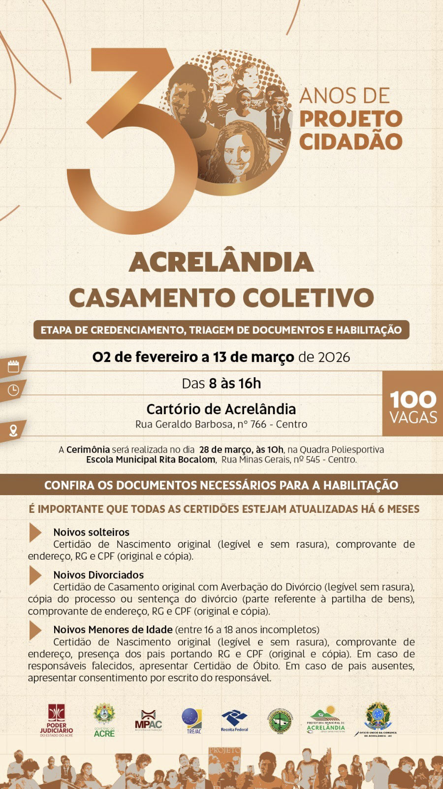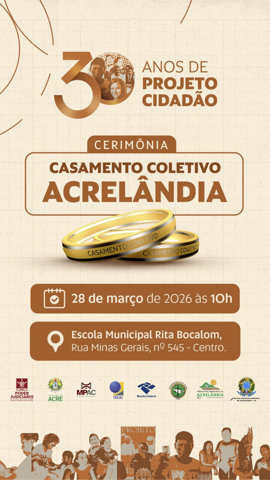 A cerimônia está prevista para o dia 28 de março, às 10h, na quadra poliesportiva da Escola Municipal Rita Bocalom, situada na Rua Minas Gerais, nº 545, bairro Centro. O objetivo da Justiça acreana é proporcionar às noivas e aos noivos em situação de vulnerabilidade econômica todos os atos do casamento, desde a habilitação até a celebração.