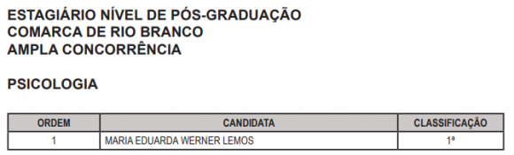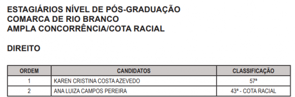 No primeiro edital, foram chamados 18 candidatas e candidatos do nível pós-graduação na área de Direito para Rio Branco, contemplando ampla concorrência e cota racial.