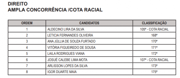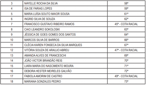A segunda lista contém três candidatas e candidatos do nível pós-graduação na área de Direito para Cruzeiro do Sul, também contemplando ampla concorrência e cota racial.