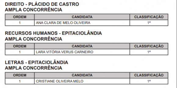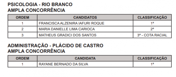 Por fim, há convocações para Plácido de Castro e Epitaciolândia no nível graduação nas áreas de Psicologia, Administração, Direito, Recursos Humanos e Letras: