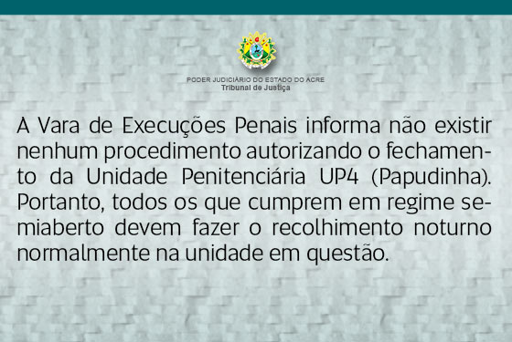 A Vara de Execuções Penais (VEP) da Comarca de Rio Branco informa não existir nenhum procedimento autorizando o fechamento da Unidade Penitenciária UP4 (Papudinha) onde ficam os presos do regime semiaberto. Portanto, todos os que cumprem pena nesta condição devem fazer o recolhimento noturno normalmente na unidade em questão. Vara de Execuções Penais da Comarca de Rio Branco