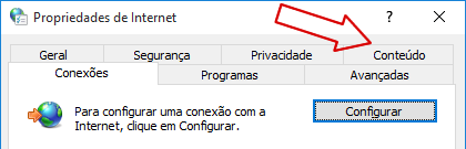 - Na sequência será mostrada a janela de Opções de internet. Clicar na aba de conteúdo;