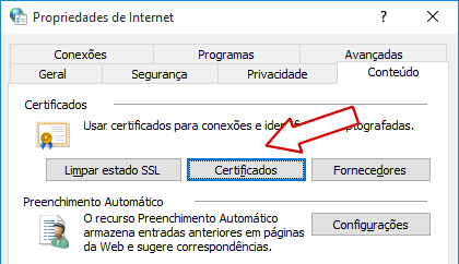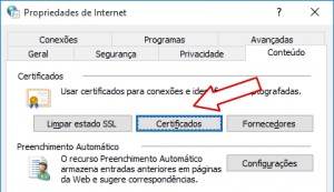 Clicar em cada certificado e clicar no botão remover, todos os certificados conectados deverão ser removidos. - Após clicar no botão fechar para sair da janela de Certificados e clicar no botão OK para sair da Janela de Opções de Internet.