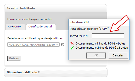 reconhecer o certificado conectado, selecione o nome do certificado conectado e clique em entrar. Na sequencia deverá ser mostrada a janela solicitando digitação do PIN do certificado digital, conforme a imagem a baixo.