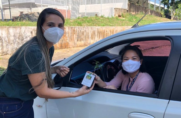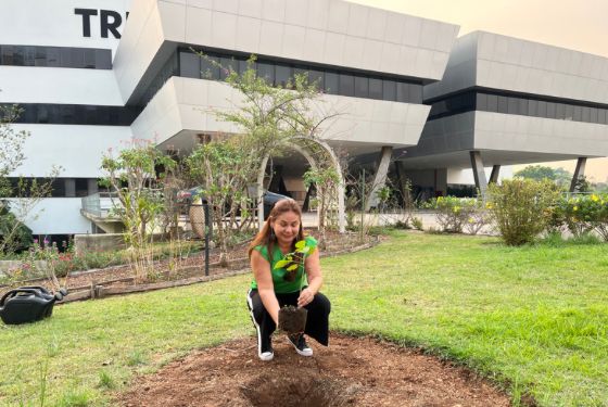 Equipe da GEVID realizou entrega de mudas ornamentais por drive thru; desembargador Camolez trocou a toga pela pá e ajudou a plantar árvores na sede do TJAC