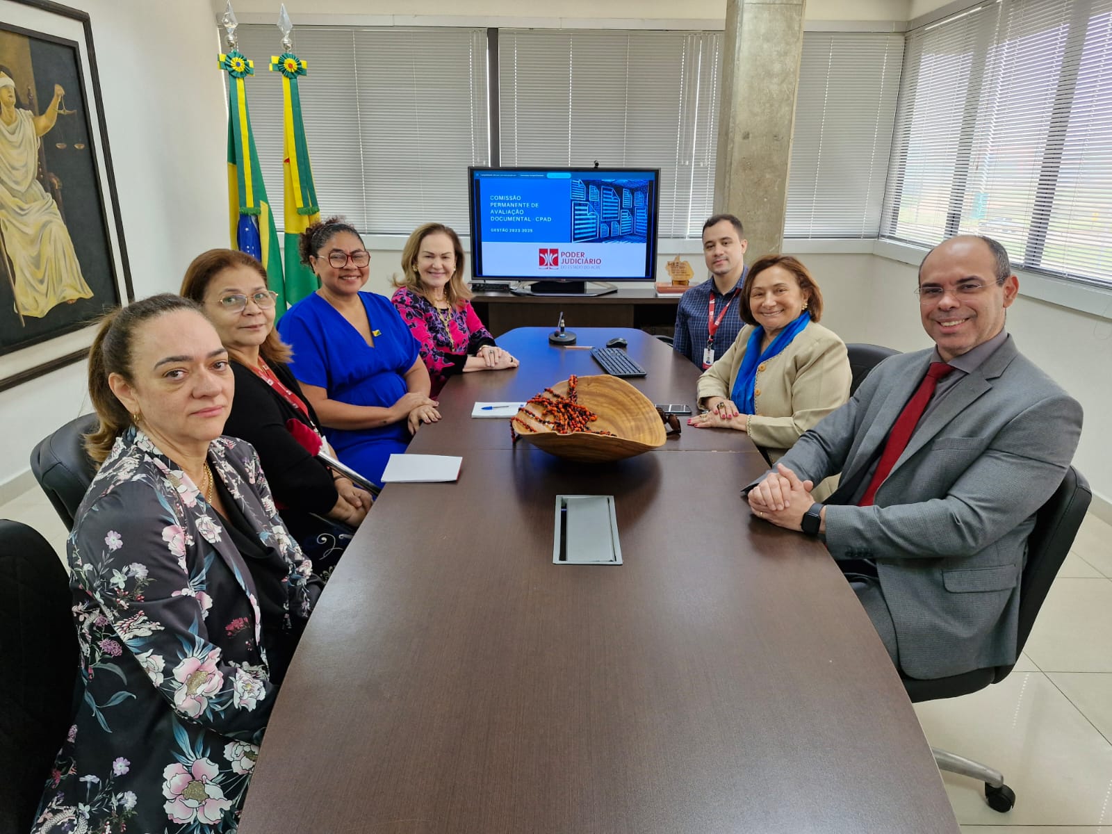 A presidente do Tribunal de Justiça do Acre (TJAC), desembargadora Regina Ferrari, recebeu a decana da Corte de Justiça e coordenadora da Comissão Permanente de Avaliação Documental (CPAD) do Poder Judiciário, desembargadora Eva Evangelista; a juíza e juiz auxiliares, Zenice Cardozo Giordane Dourado; a gerente de Acervos, Ana Cunha; o titular da Gerência de Processos (Gepro), Bono Maia; bem como a assessora do gabinete da juíza auxiliar, Cleide Prudêncio para debater avanços na gestão documental.